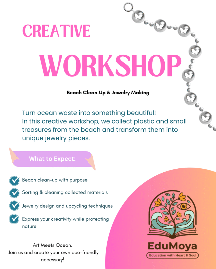 The workshop begins with a group walk on the beach, during which plastic waste is collected, sorted, and cleaned. This is followed by the creative phase: cutting, sanding, painting, combining—each piece tells its own story.