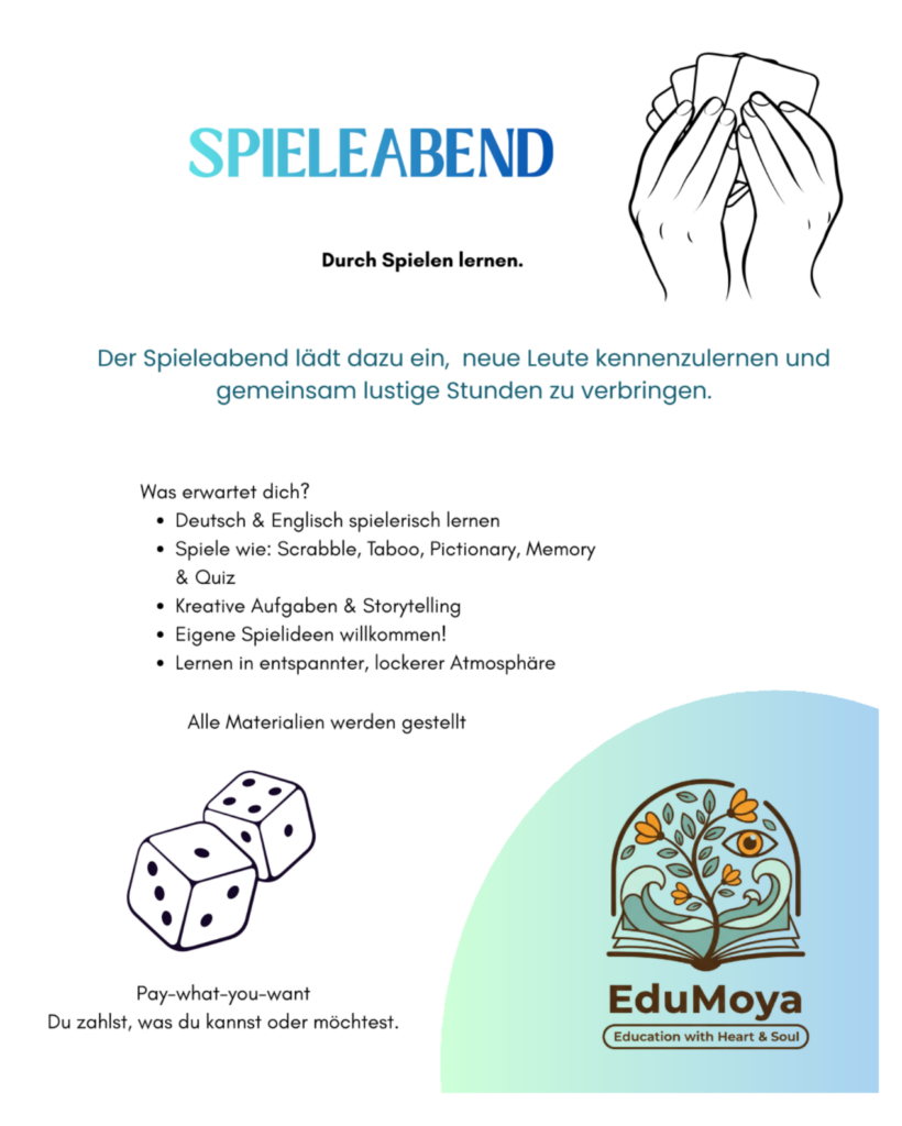 Der EduMoya Sprach- & Spieleabend findet jeden Mittwoch statt und lädt Jugendliche und Erwachsene dazu ein, Deutsch und Englisch in entspannter Atmosphäre spielerisch anzuwenden. Lernen geschieht hier ganz nebenbei – durch Spiele, Quizfragen, kreative Aufgaben und gemeinsames Lachen.